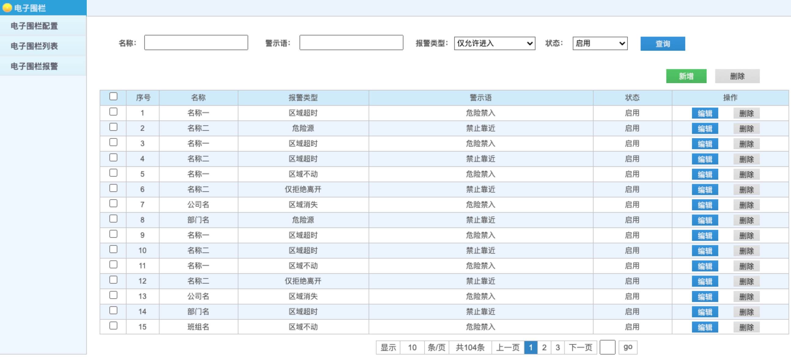 电子围栏管理,包括电子围栏配置、列表及报警管理功能